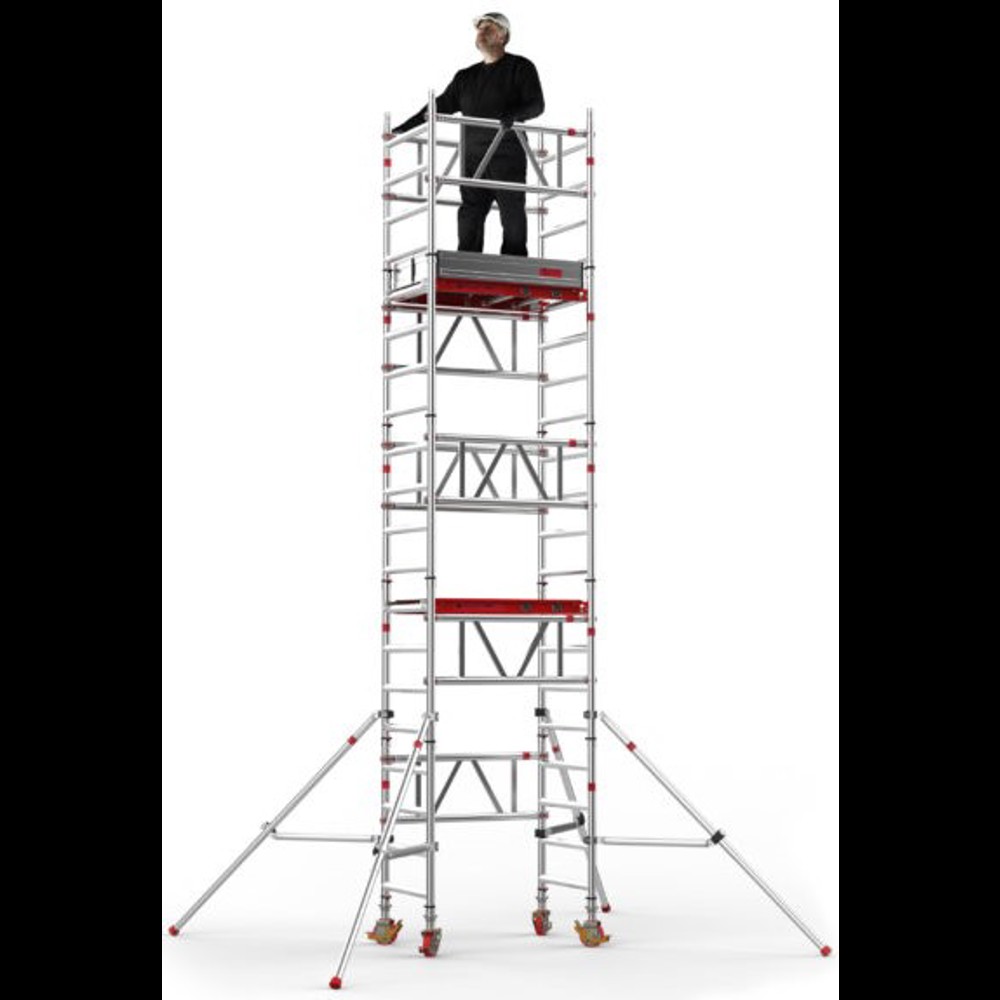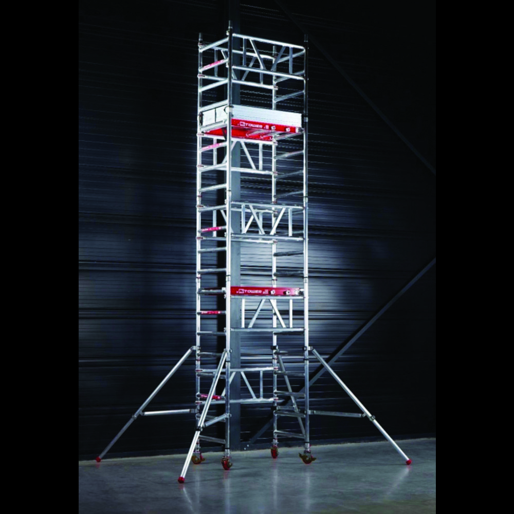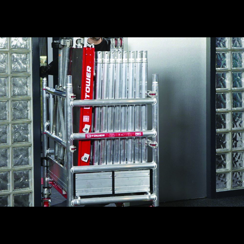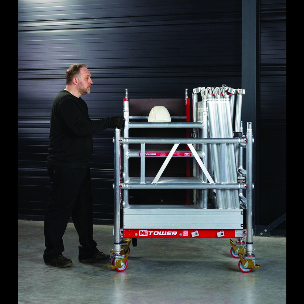 The MiTower is a versatile access tower designed to be safely erected and dismantled by one person. The base of the MiTower doubles as a storage trolley to hold the components during transport, which can fit through standard doorways. Easy-clip frame clips and easy-lock stabilisers secure the components, resulting in a stable and rigid access tower perfectly suited to tight spaces. The platform features two retractable hangers that may be used to store components when assembling and dismantling the tower