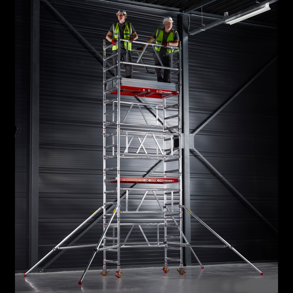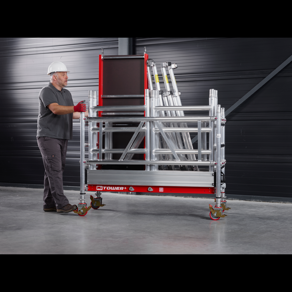 The MiTower+ is a bigger version of the MiTower. One person is still easily able to erect and dismantle it, but the 1.5m long platform means that two people can work from it. The storage and transport trolley forms the base of the tower so it is really easy to keep all the components together when not in use, when being transported and at the job.