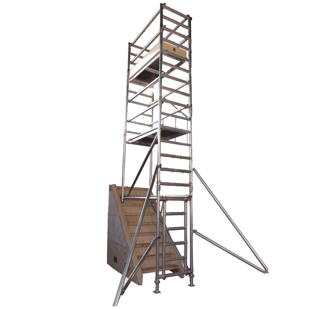 Adjustable base plates that sit on stairway steps and unique stabilisers provide a stable and safe platform to work from. In addition, a toeboard set is provided that helps prevent items falling off the platform. Twin guardrails are provided as standard with each tower to increase safety for workers.