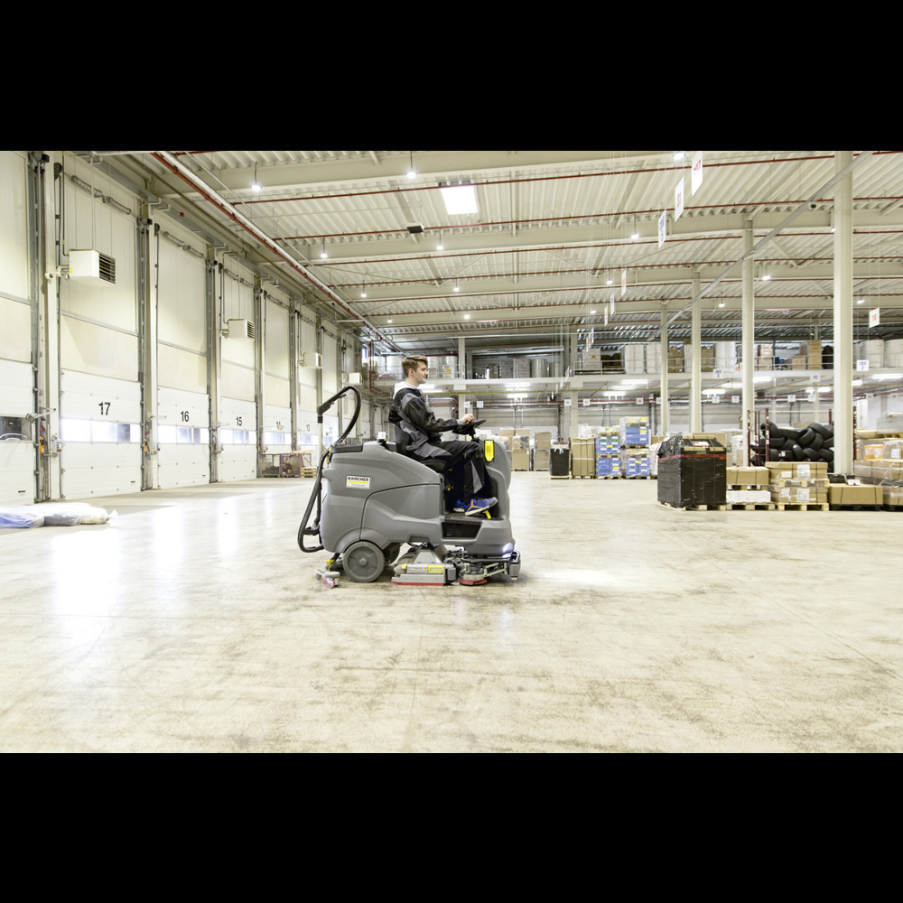 With its aluminium roller brush head with a pre-sweeping function and an 85 cm working width, this B 150 R Bp ride-on scrubber dryer performs impressively during tough, everyday cleaning applications and achieves an area performance of up to 5100 m² per hour.