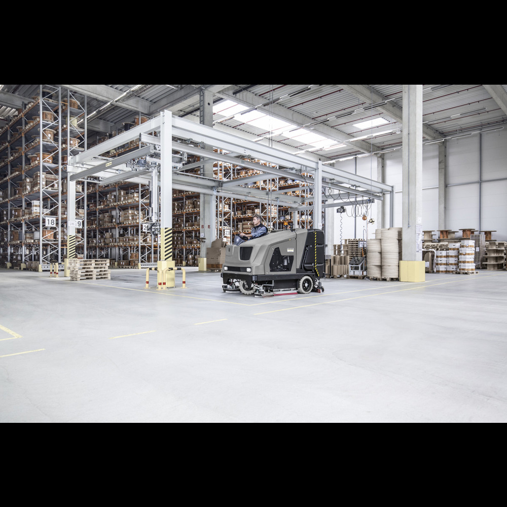 Thanks to an extra large roller brush, a ride-on scrubber drier becomes the 300 RI diesel combination machine, which enables scrub vacuuming and sweeping in one work process. Diesel-operated, with a large water tank (300 litres) and a working width of up to 1755mm, it is ideally suited to maintenance cleaning and deep cleaning of large areas.