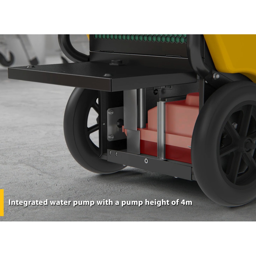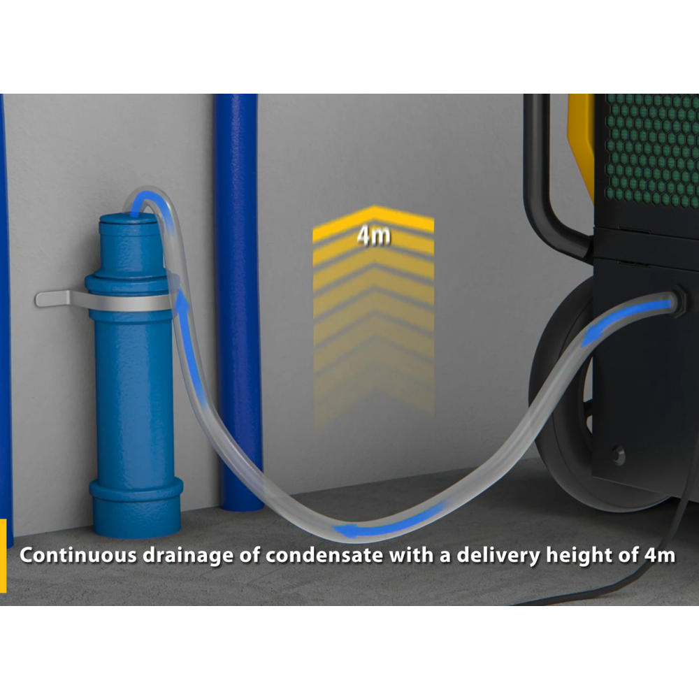 Pumped dehumidifiers extract moisture from the air and pump the water out through a hose. This means you can leave the dehumidifier on for extended periods where a traditional dehumidifier would fill up its tank and stop working.