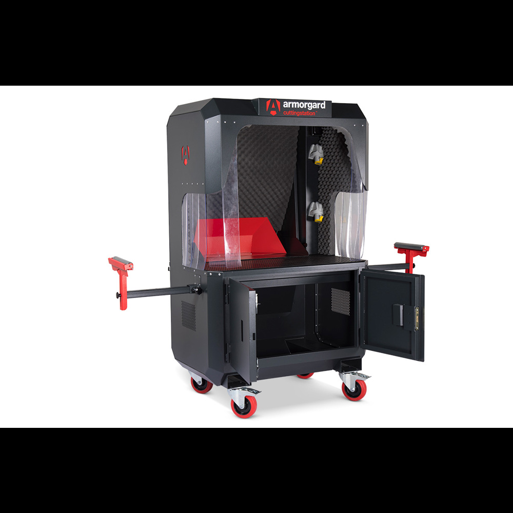 The design of this Armorgard SS7 cutting station has health and safety of the operator in mind by reducing both vibration and noise, improving user comfort and containment of dust and sparks generated during cutting.