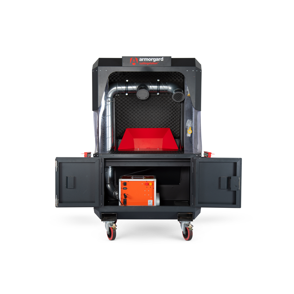 The Armorgard SS7X is a a multi-purpose cutting platform, with a secure cabinet beneath the workbench area that houses the air filtration unit. The combination of acoustic foam, built-in light, air filtration and cutaway sides make for safe cutting of lengths of materials including wood and conduit.