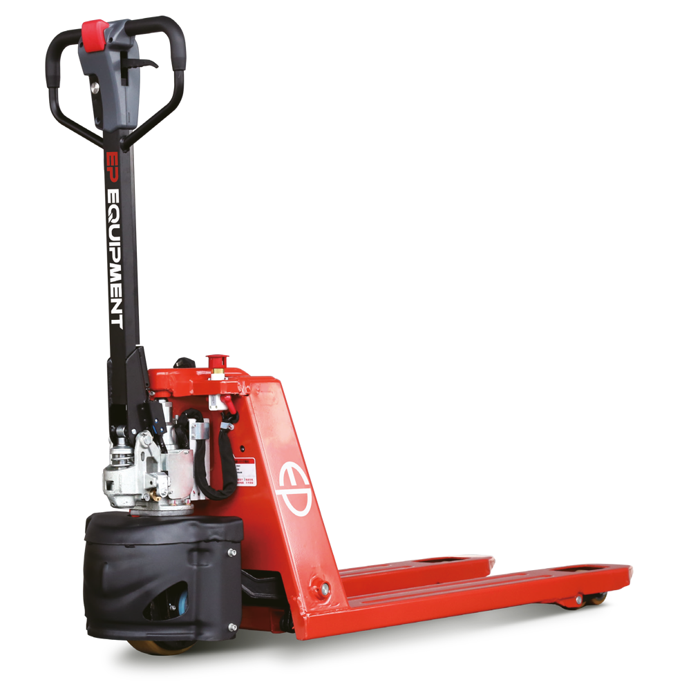 This electric pallet truck features an electric drive wheel and manual pump to make moving pallets easy and safe.