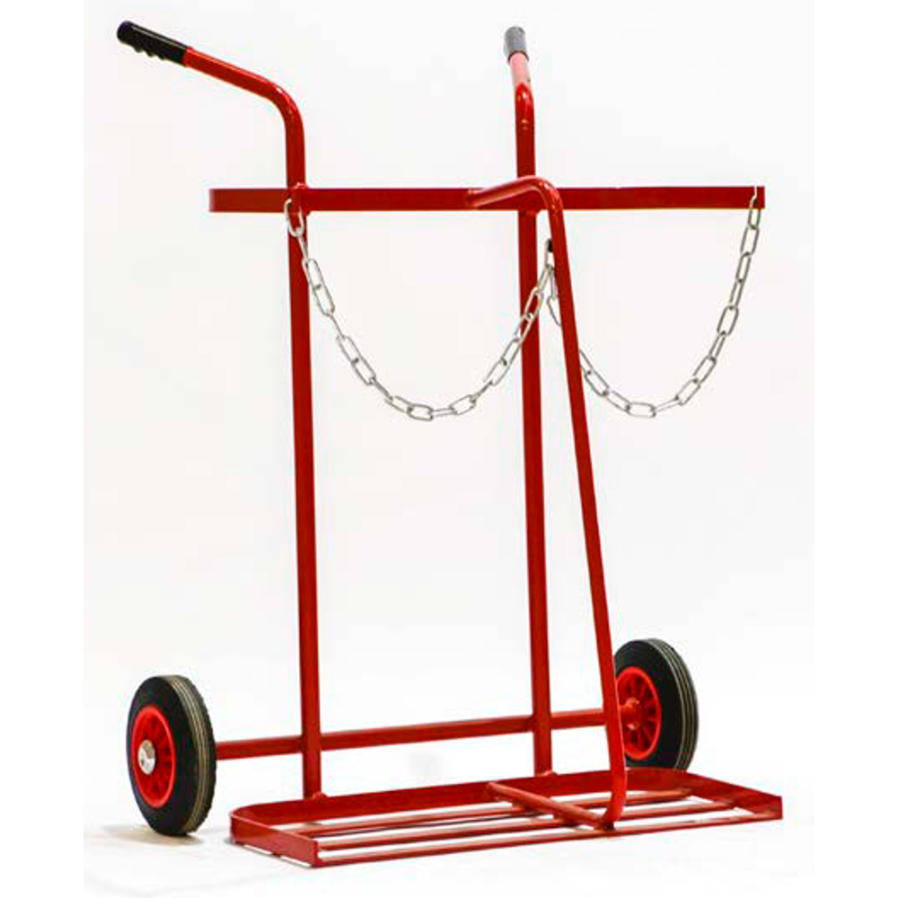 Twin cylinder trolley with solid 20cm /8in tyre wheels. This type of cylinder trolley is manufactured to hold 2 large size cylinders. Its fully welded construction ensures strength and reliability.