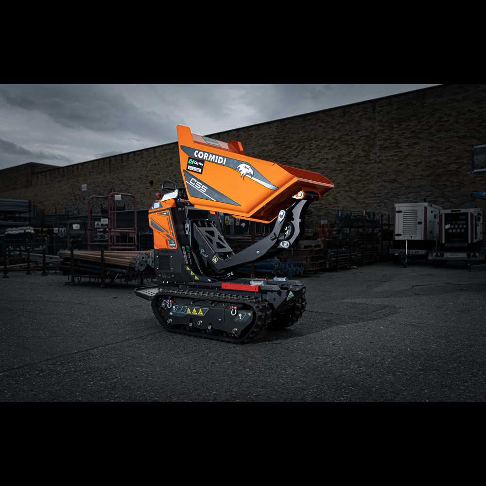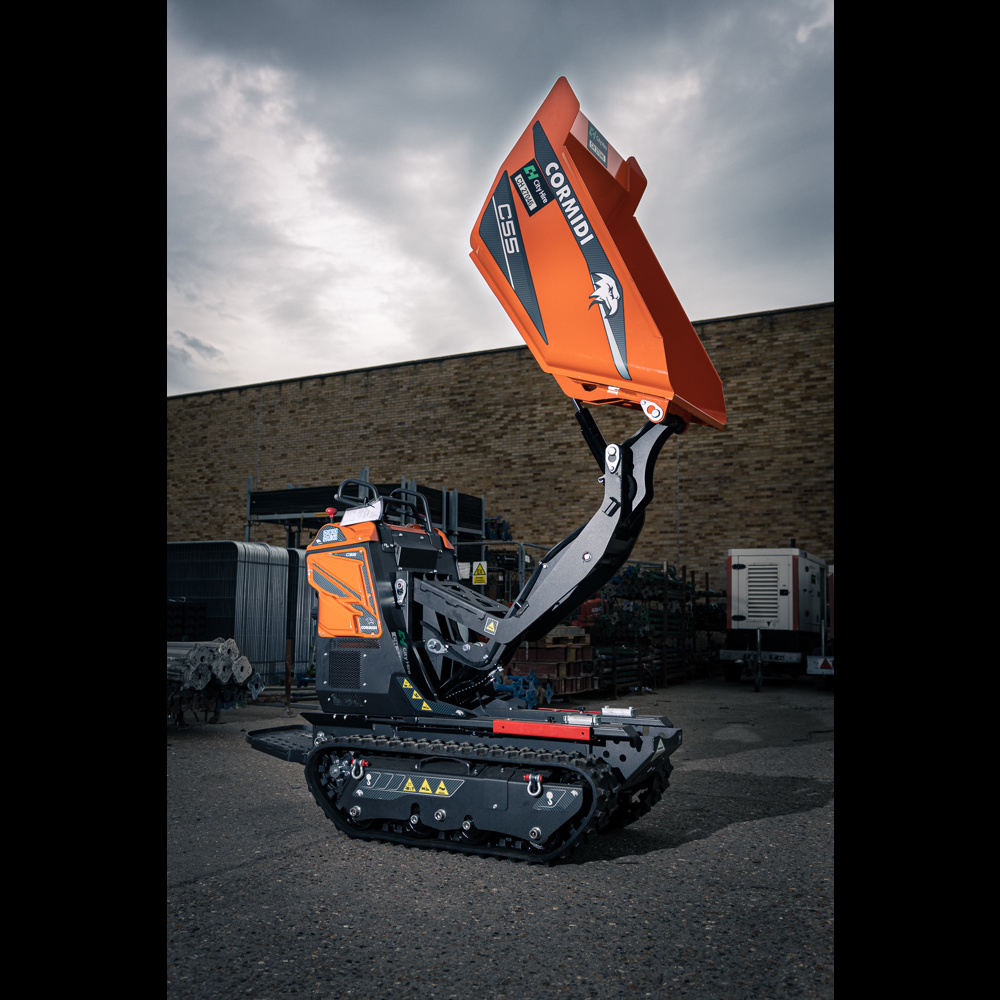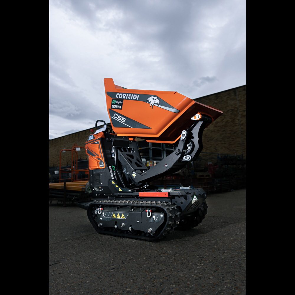 Cormidi C55 Tracked Dumpers are very compact, walk-behind machines which are designed to fit through narrow passages and low entrances. Although small, their hi-lift discharge enables them to fill standard skips.