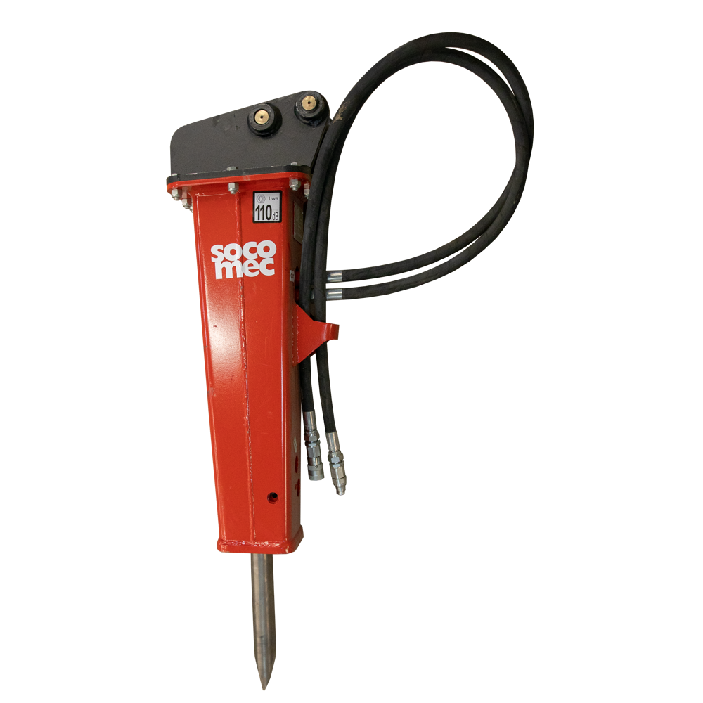 This machine is a hydraulic breaker attachment (sometimes called a pecker) for the Kubota Excavators in the City Hire fleet. They connect to the excavator via hydraulic hoses and provide a powerful hammering action for heavy duty demolition of concrete slab.