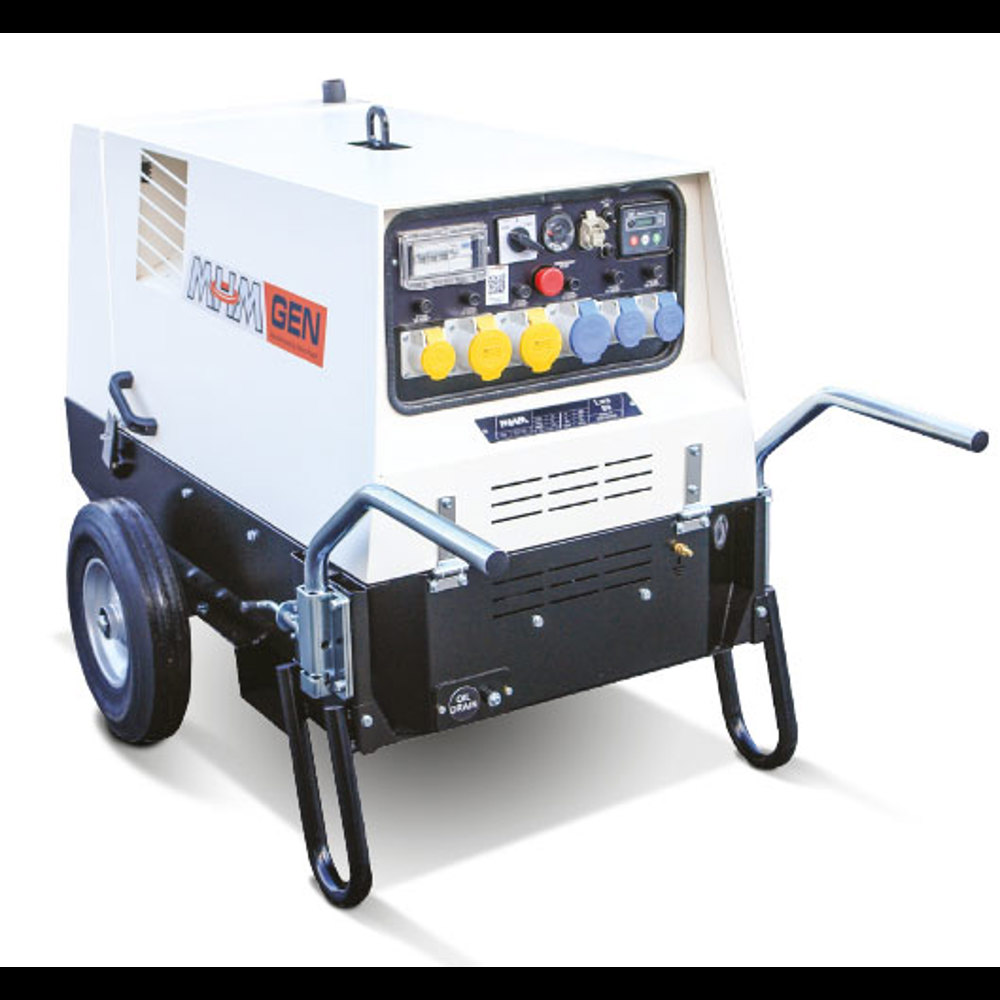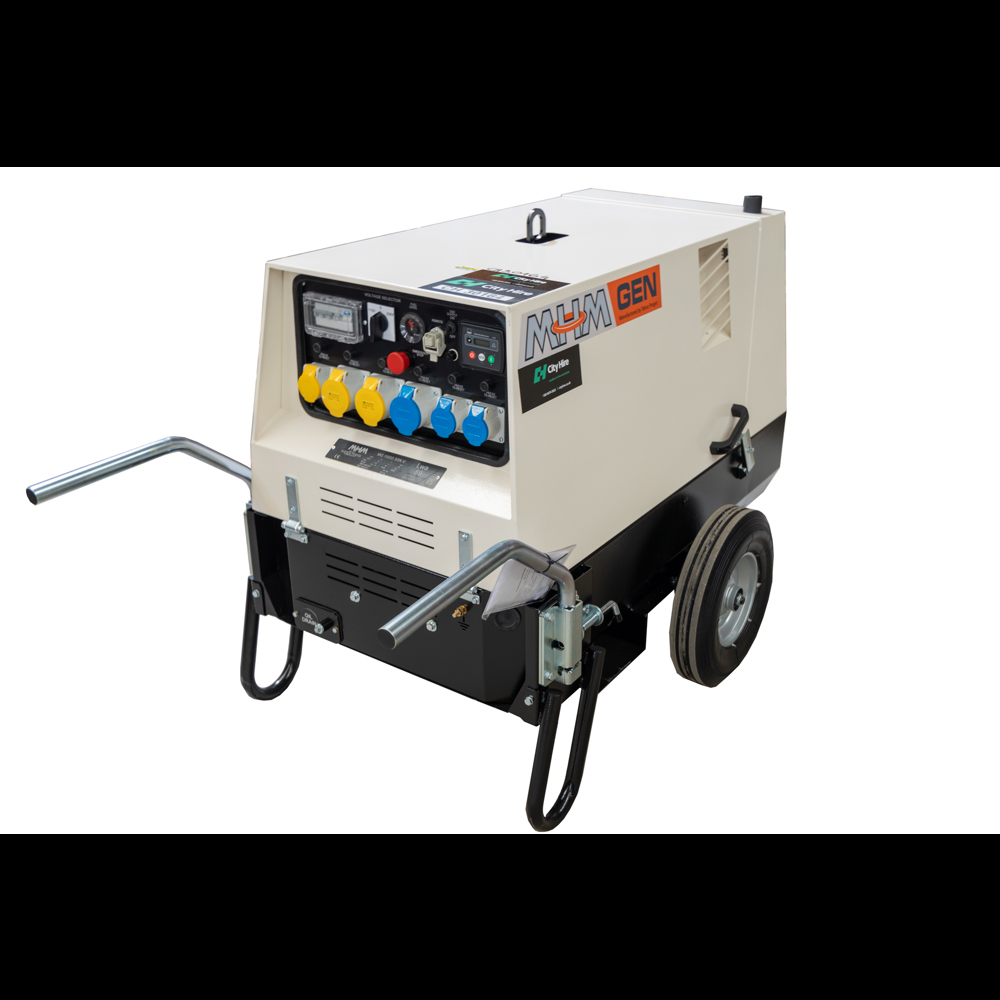 10kVA Generators are silenced and offer a very high output whilst remaining wheeled and portable. These generators are diesel driven and offer the highest choice of outlets for a portable unit.