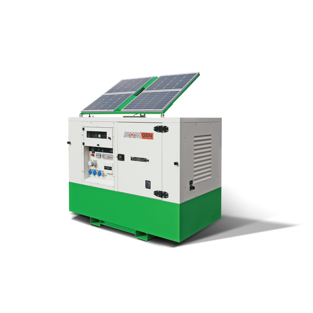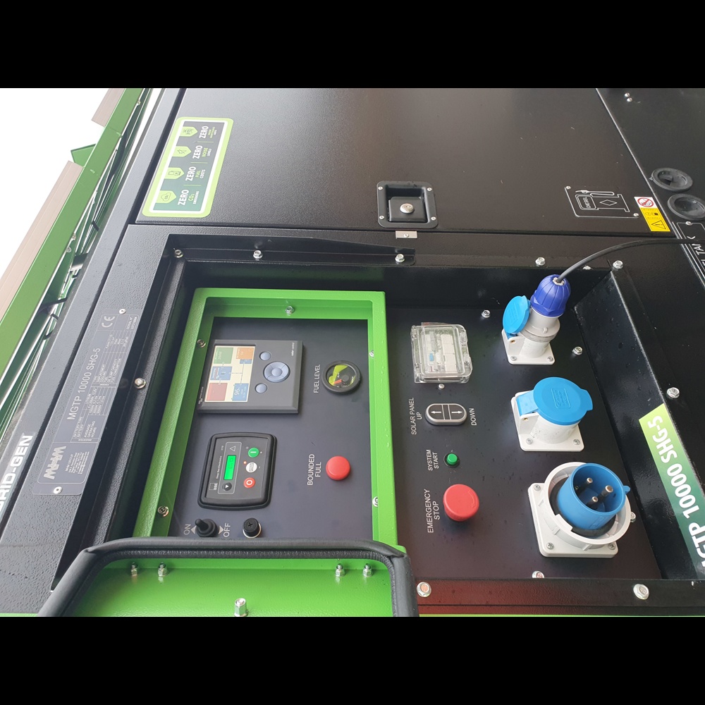 This generator gets power from a PV solar panel, and also a stage 5 diesel engine. The generator will choose to run on battery power where it can, significantly reducing fuel consumption typically in excess of 70%.