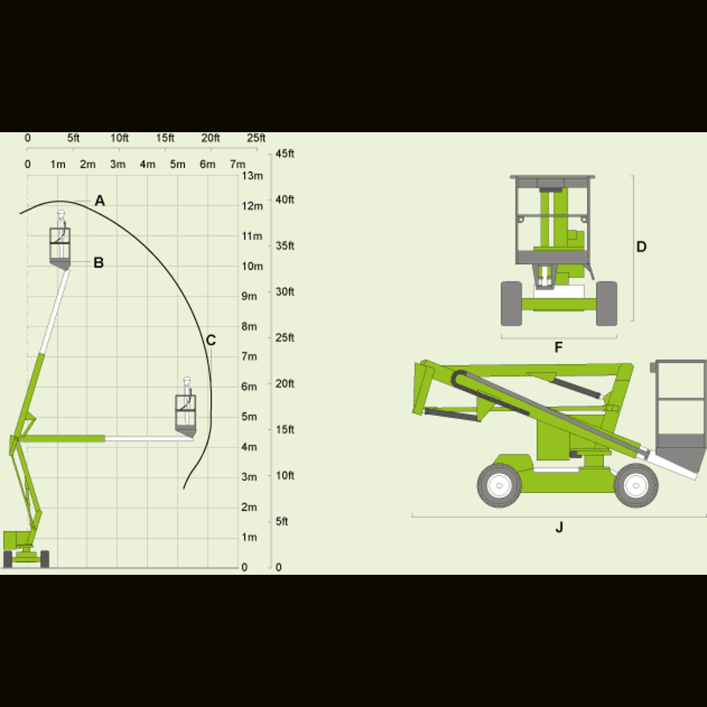 The HeightRider 12 Narrow is a highly versatile and accurate self-propelled boom lift. They may be powered by a built in battery pack, diesel engine, or a combination or both enabling them to be used for extended periods both indoors and outdoors. Machines may be operated from the platform or the ground.