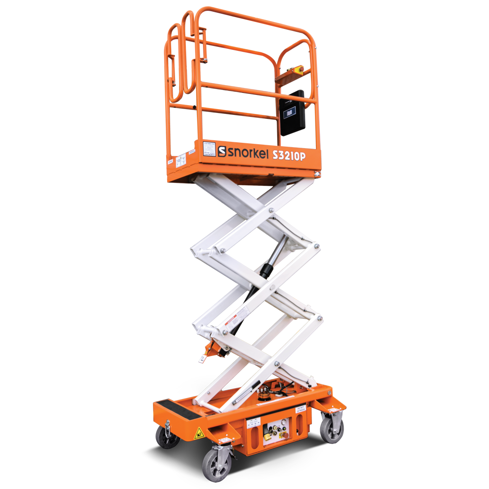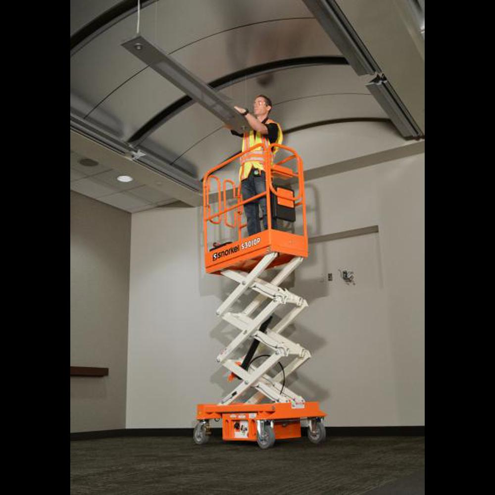 The Snorkel S3010P is a push around scissor lift suitable for accessing ceilings for interior work such as mechanical & electrical installation, air conditioning, or interior decorating.