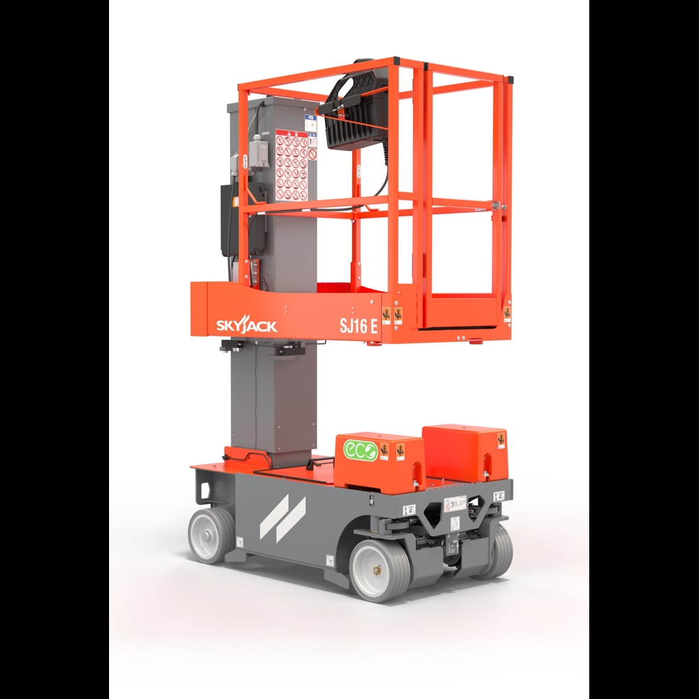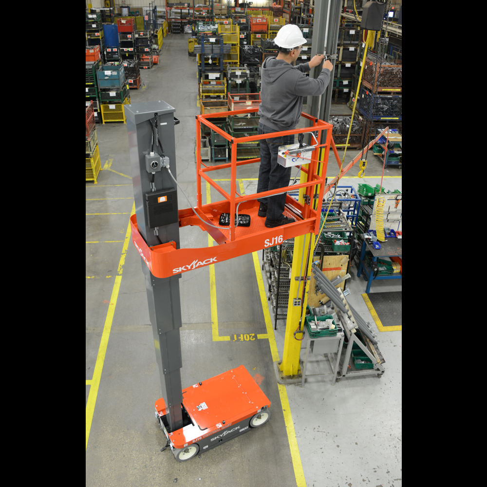 The Skyjack SJ16 is a self-propelled vertical mast designed for working at height indoors effectively.